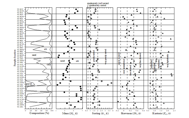 - Average particle size, skewness, kurtosis, degree of sorting identifying